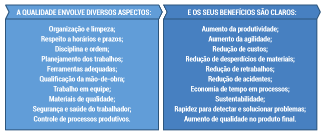 Apesar de ser um conceito subjetivo relacionado à percepção de cada indivíduo, a qualidade pode ser claramente percebida em diversos aspectos de uma obra. Em uma implementação industrial, ela não deve ser aferida apenas ao final da execução de um serviço, e sim em cada etapa das atividades envolvidas, diária e constantemente.